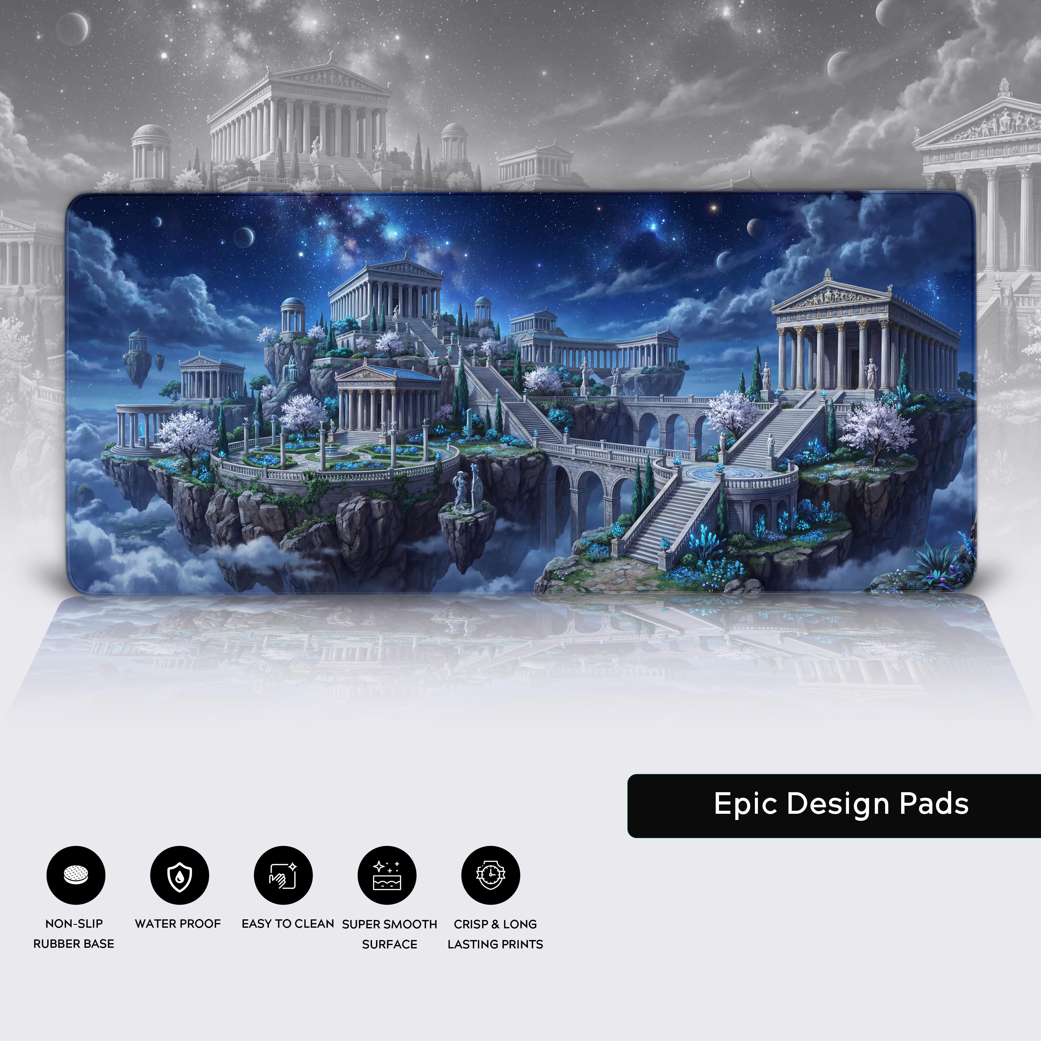 Transform your desk from a mere workspace into an eternal sanctuary for thought and creation. The Astral Pantheon desk mat captures the silent majesty of classical temples drifting through a star-filled nebula, bathed in the ethereal glow of distant galaxies.