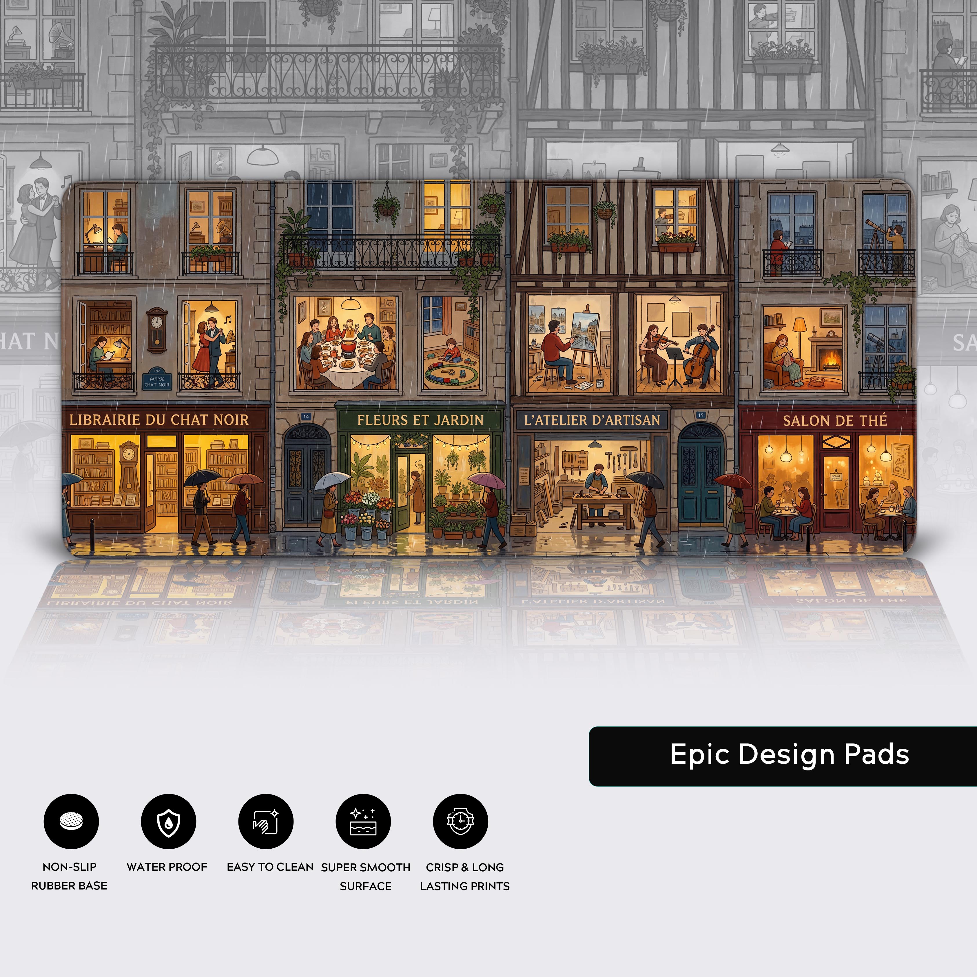 Escape the chaos and find your focus with the Rainy Street Facade desk mat. This beautifully illustrated mat captures the cozy feeling of being tucked away inside while the rain patters down on a charming European street. Gaze into the warmly lit windows of a bookstore, a flower shop, and an artisan's workshop, each telling its own quiet story.