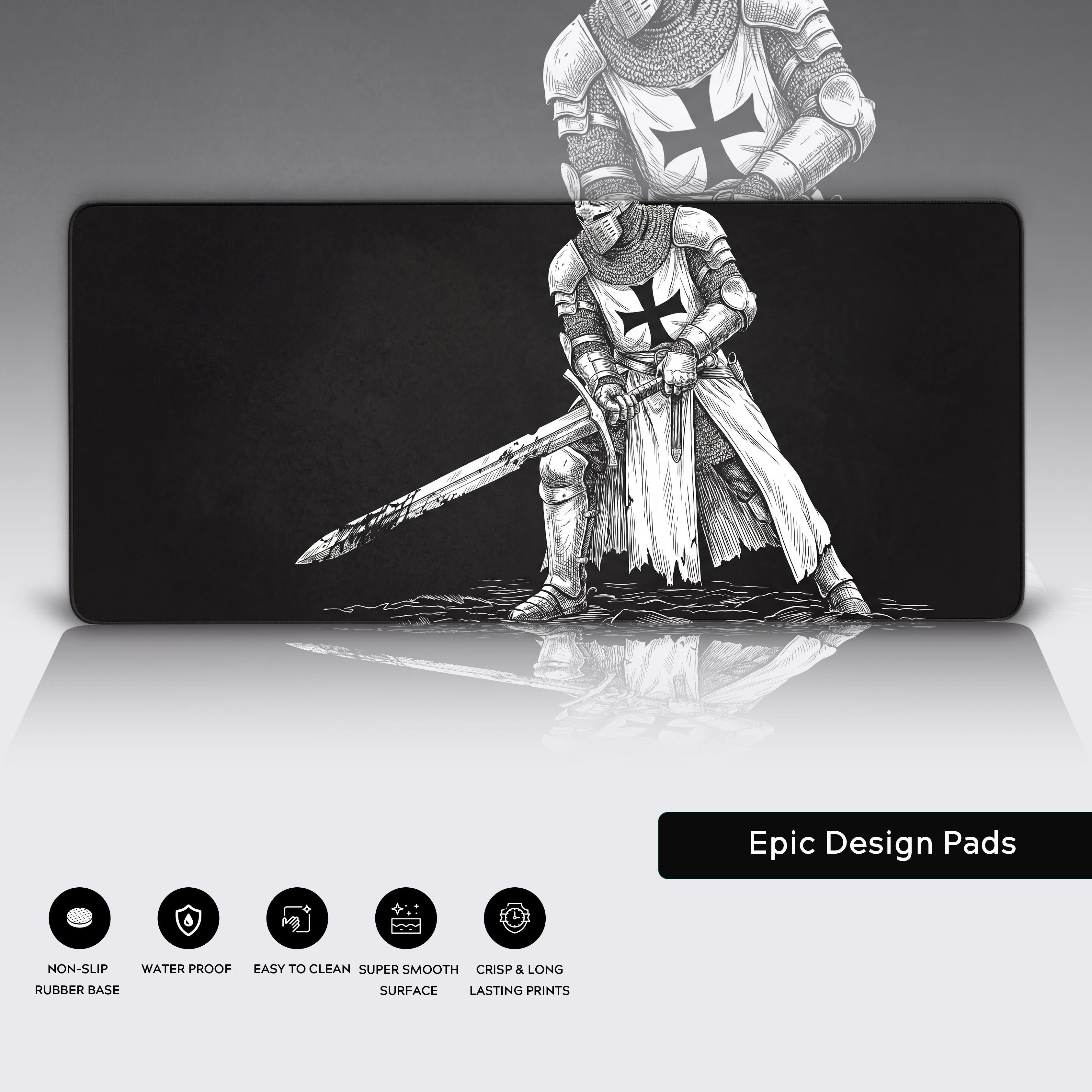 Channel the unwavering discipline of a master duelist with the Crusader's Stance desk mat. This design isolates the warrior in a moment of intense focus, captured in a stark, high-contrast woodcut aesthetic. It’s a powerful statement for anyone who values precision, skill, and mastery in high-stakes environments.