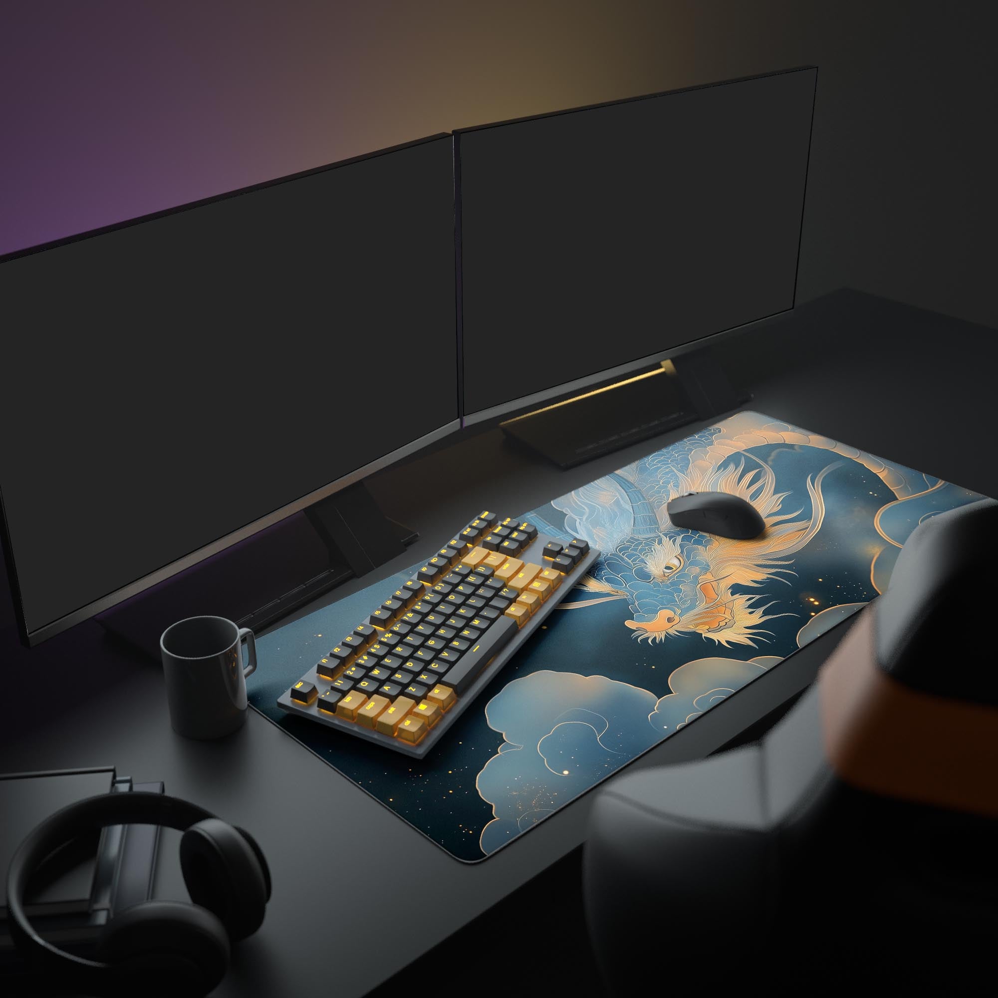 Transform your workspace with the Blue Japanese Dragon Desk Pad, where traditional Japanese artistry meets cosmic fantasy. This desk mat features a majestic dragon with shimmering blue scales and flowing golden accents, surrounded by swirling clouds that radiate a celestial atmosphere. Its intricate details and piercing eyes make a bold statement, while a dark star-speckled background enhances the vibrant colors.