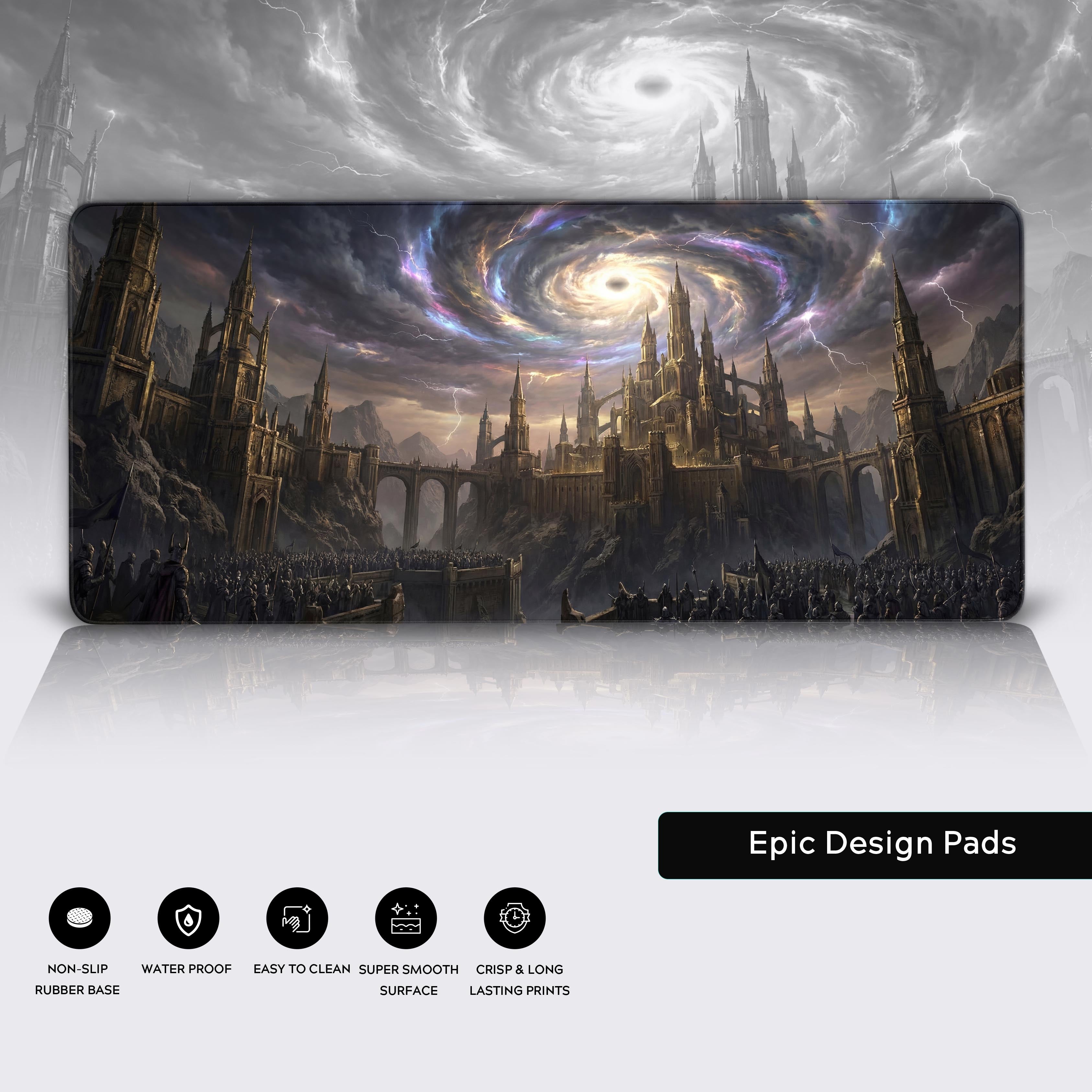 Transform your desk into a bastion of power with the Celestial Siege desk mat. Witness a colossal fortress stand defiant against a swirling cosmic vortex, where lightning cracks across a bruised purple sky. Below, an army awaits an epic clash, a scene that inspires resilience and unwavering focus.
