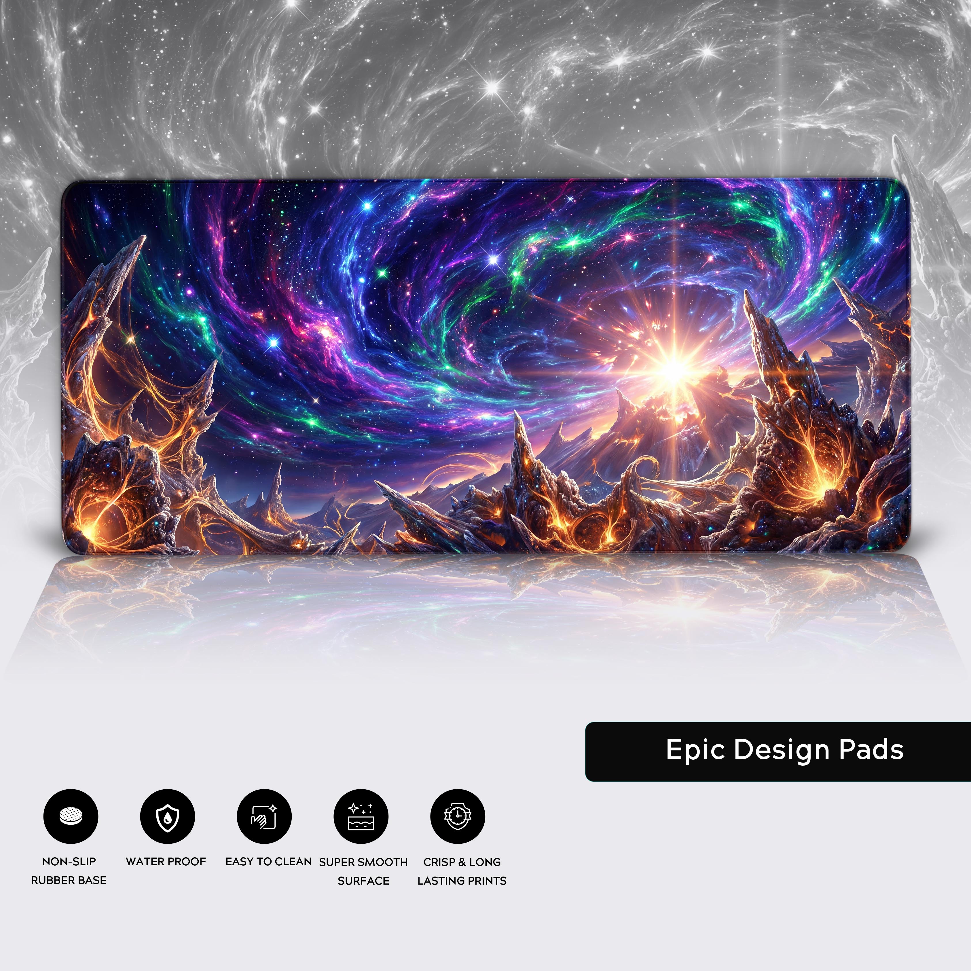 Transform your desk into the epicenter of a cosmic genesis. This design captures the breathtaking moment a new world is born, with jagged, molten terrain glowing beneath a sky ablaze with swirling nebulas of purple, blue, and teal. It's a view from the edge of creation itself.