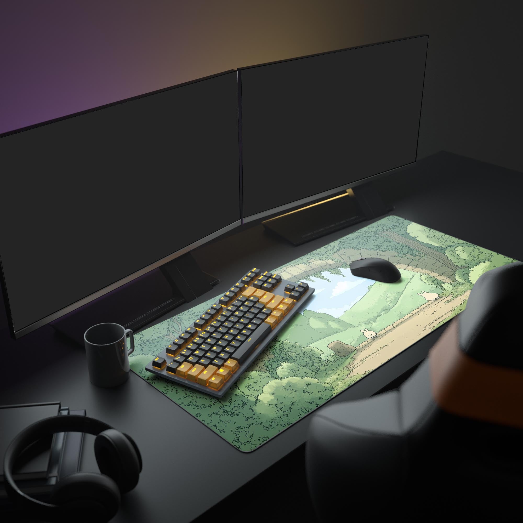 Designed with a smooth micro-woven cloth surface and anti-slip backing, this desk pad ensures maximum control, whether you're working, gaming, or browsing. Its playful scene—a peaceful forest with lush trees, an old stone bridge, and two adorable animal friends—adds a heartwarming touch to your desk.