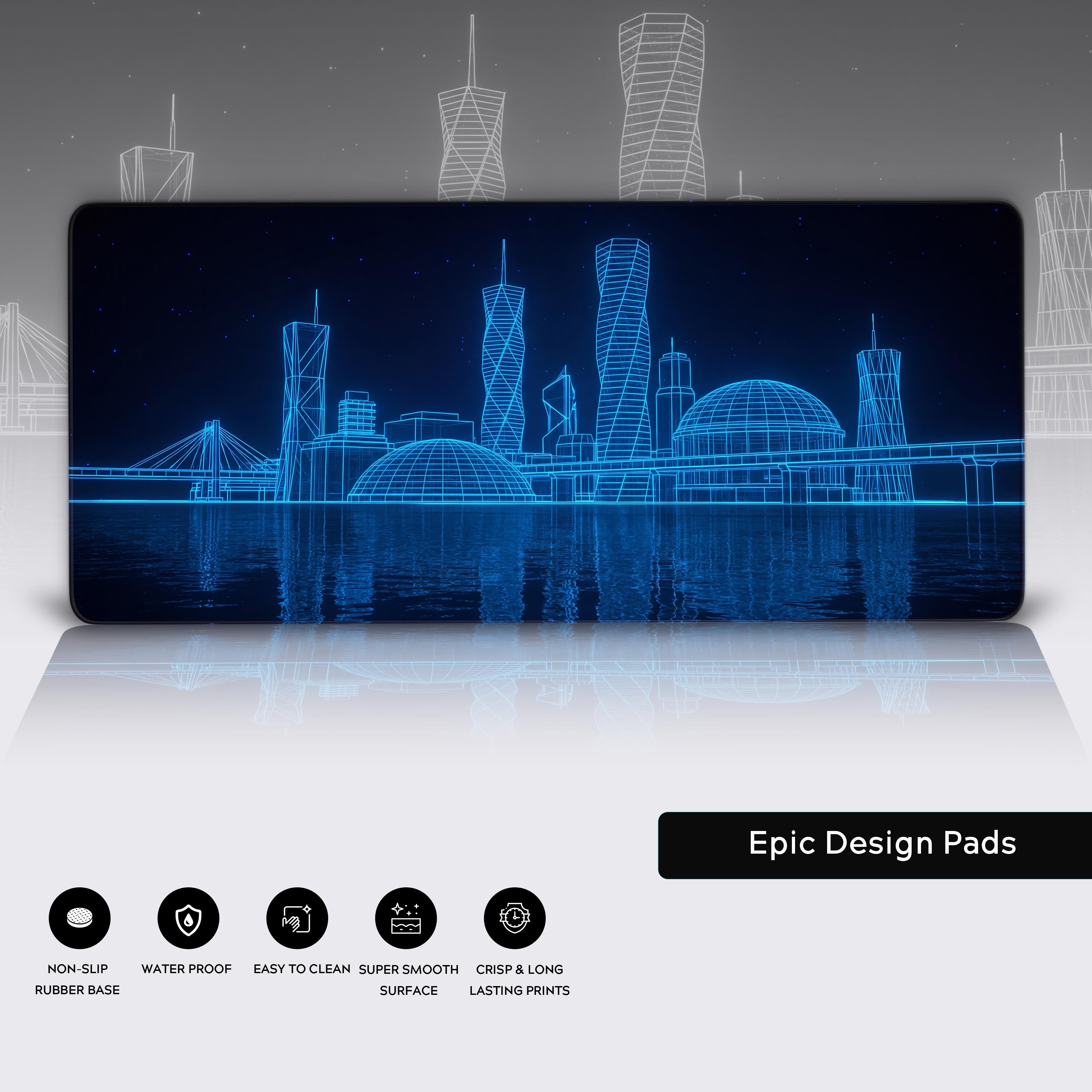 Step into the digital void with the Digital Skyline desk mat. This isn't just a surface; it's the blueprint of the future, featuring a mesmerizing neon-blue wireframe city that glows with electric clarity. Its holographic aesthetic transforms your desk into a grid of pure potential, perfect for the architect of code or the dreamer of systems.