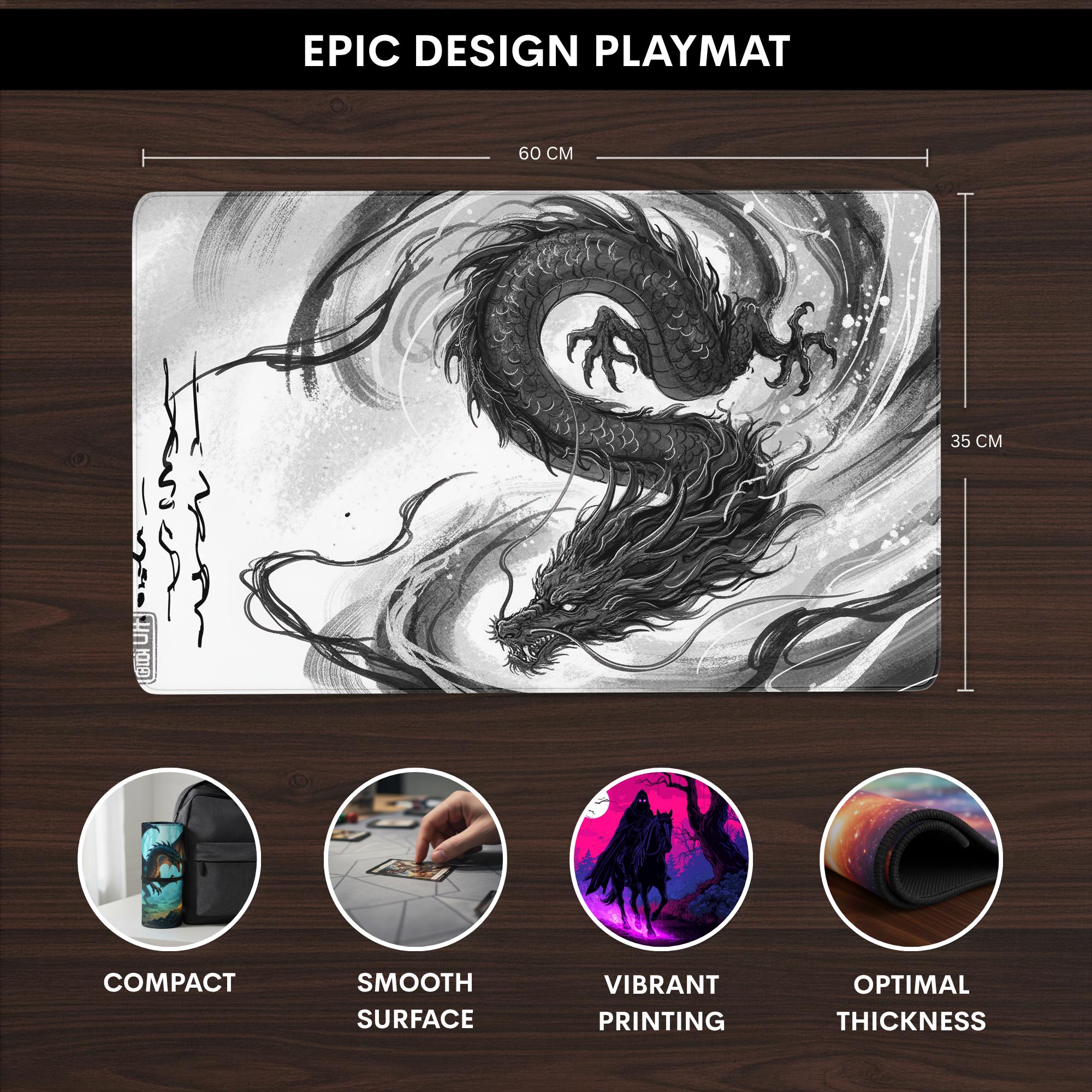 Unleash the spirit of a legendary dragon right on your desk. The "Dragon's Path" playmat isn't just a surface; it's an arena. Feel the divine energy of the magnificent black dragon, rendered in a striking sumi-e ink wash style that transforms your space into a gallery of minimalist power.