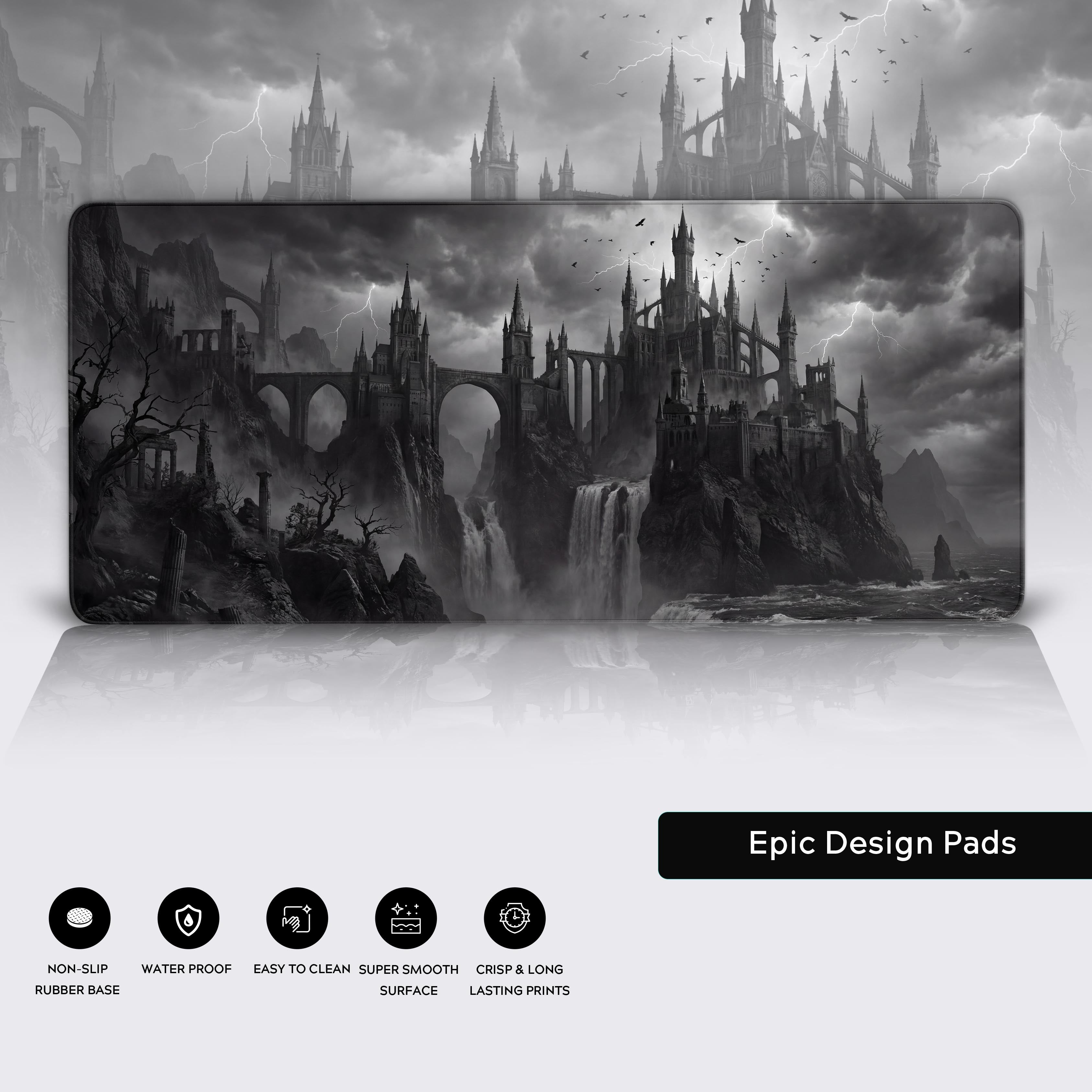 Transform your desk into a realm of brooding intensity with the Forgotten Fortress desk mat. This monolithic gothic citadel, set against a stormy, lightning-streaked sky, isn't just a design—it's a statement. It’s for those who find inspiration in the melancholy romance of ancient, unconquerable places.