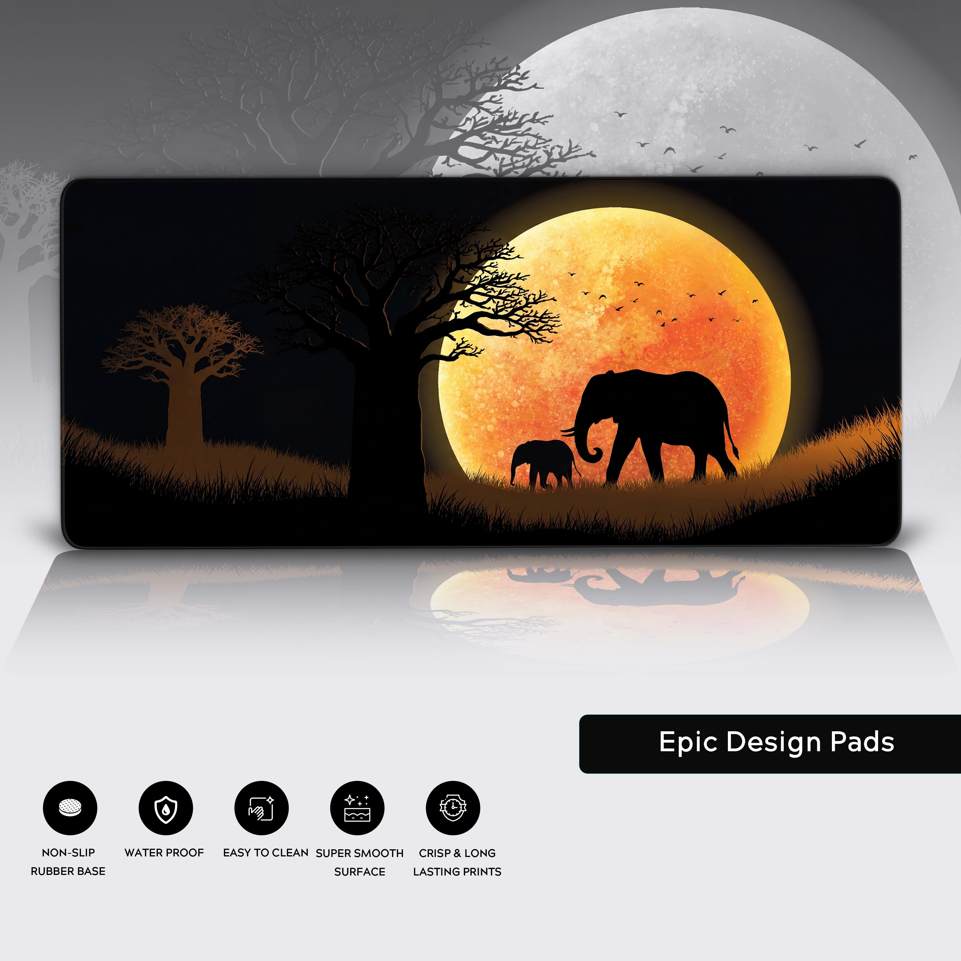 Transform your desk into a scene of quiet majesty with the Golden March desk mat. This design captures the profound bond between elephants, silhouetted against the warm, textured glow of a supermoon. It’s a powerful statement piece that brings the serene, ancient rhythm of the savannah right to your workspace.
