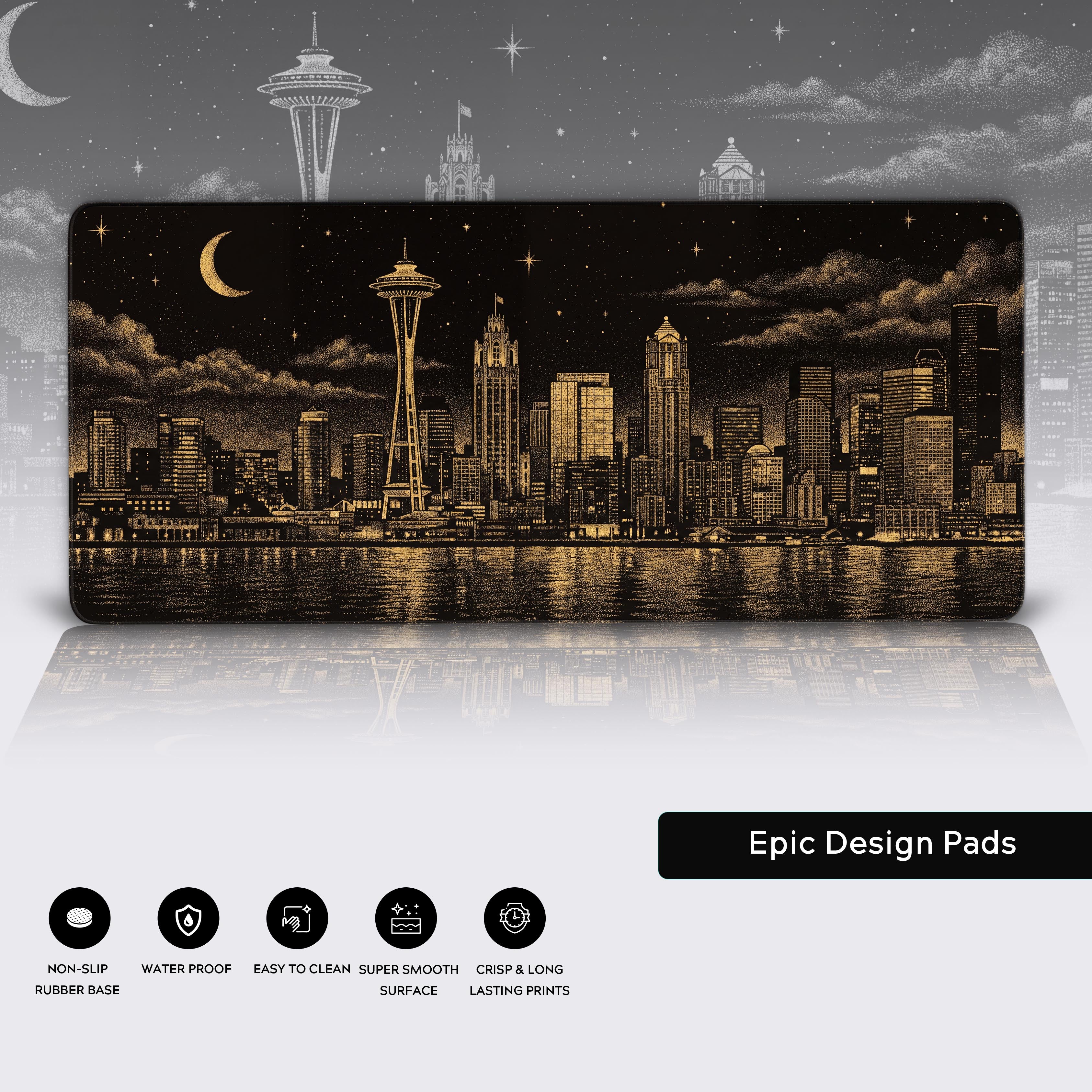 Transform your desk into a constellation of ambition with the Golden Skyline desk mat. This design renders the iconic Seattle skyline in a stunning gold and black pointillist style, blurring the line between city lights and the stars above. It’s a tribute to the night owl, the dreamer, and the builder—perfect for those hours when your best work gets done.