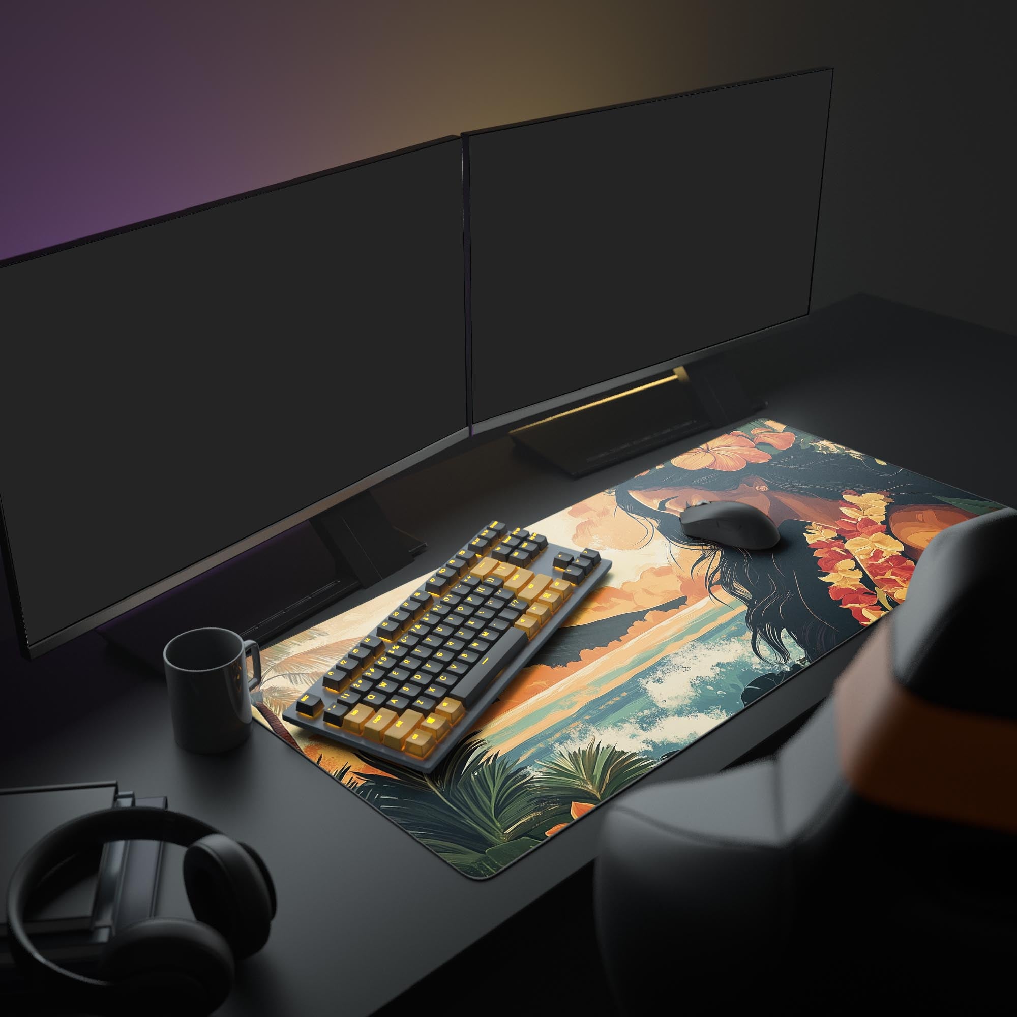 Embrace the serenity of island life with our Hawaiian Desk Pad, crafted to elevate your workspace experience. This exceptional desk mat features a stunning tropical scene with a Polynesian woman adorned with vibrant flowers and a traditional lei, set against a picturesque island backdrop complete with volcanoes and lush greenery.