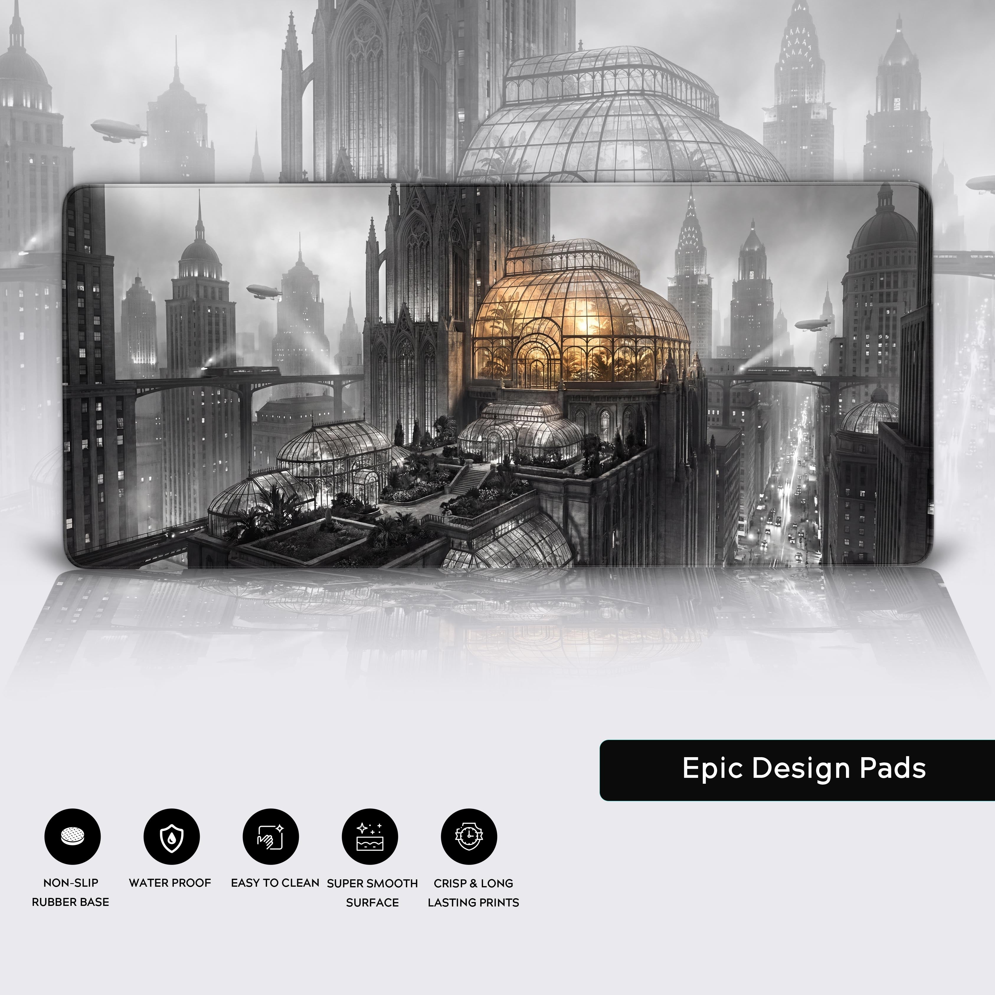 In a world of cold efficiency, your desk should be a source of inspiration. The 'Industrial Eden' desk mat captures this perfectly, contrasting a sprawling, monochrome Art Deco metropolis with a single, warmly lit glass conservatory. It’s a stunning reminder that creativity and warmth can thrive anywhere.