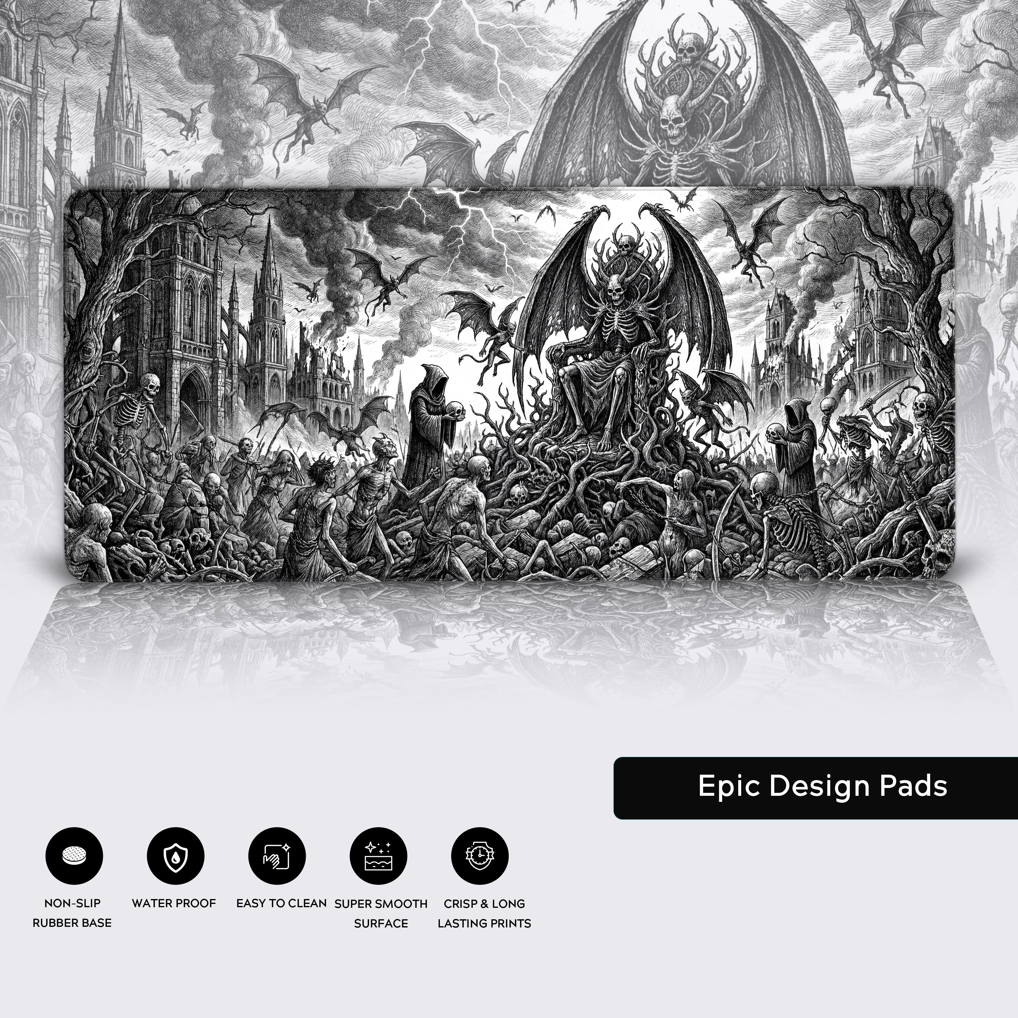 Transform your desk into a scene from a forbidden grimoire with the Infernal Court desk mat. This stunning woodcut-style masterpiece depicts a skeletal sovereign presiding over a ruined, undead kingdom. Every detail, from the crumbling gothic spires to the army of the damned, creates an atmosphere of epic, dark fantasy.