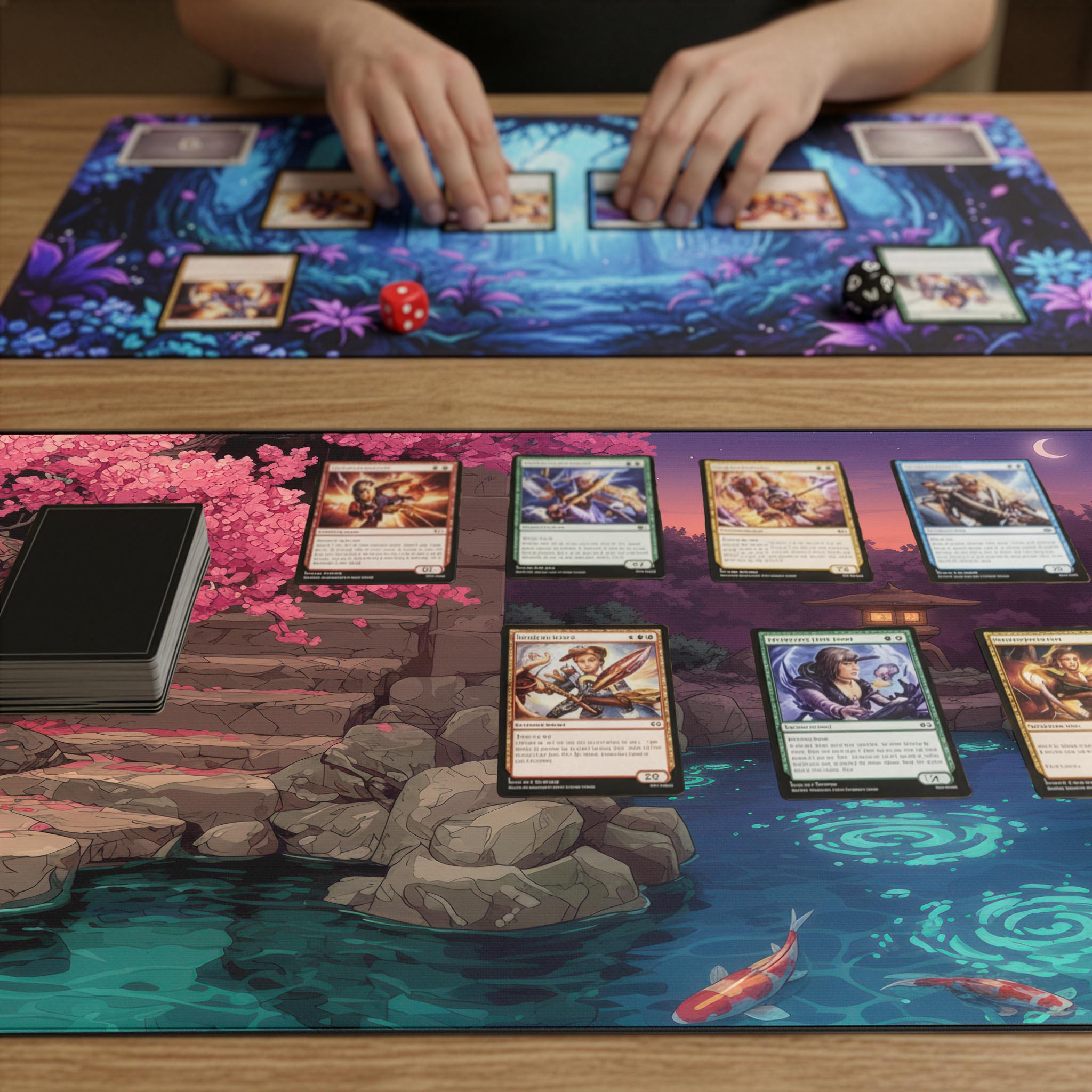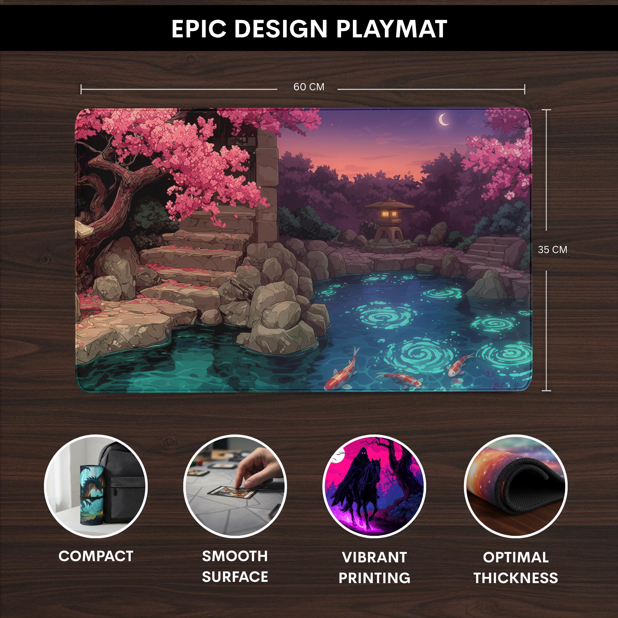 Transform your desk into a tranquil sanctuary with the Koi Garden Playmat. Lose yourself in a captivating dusk scene where vibrant cherry blossoms bloom under a crescent moon, creating a perfect atmosphere for focus and calm. Feel the day's stress melt away as you gaze upon a peaceful koi pond, where three graceful fish emit a gentle, magical cyan glow.