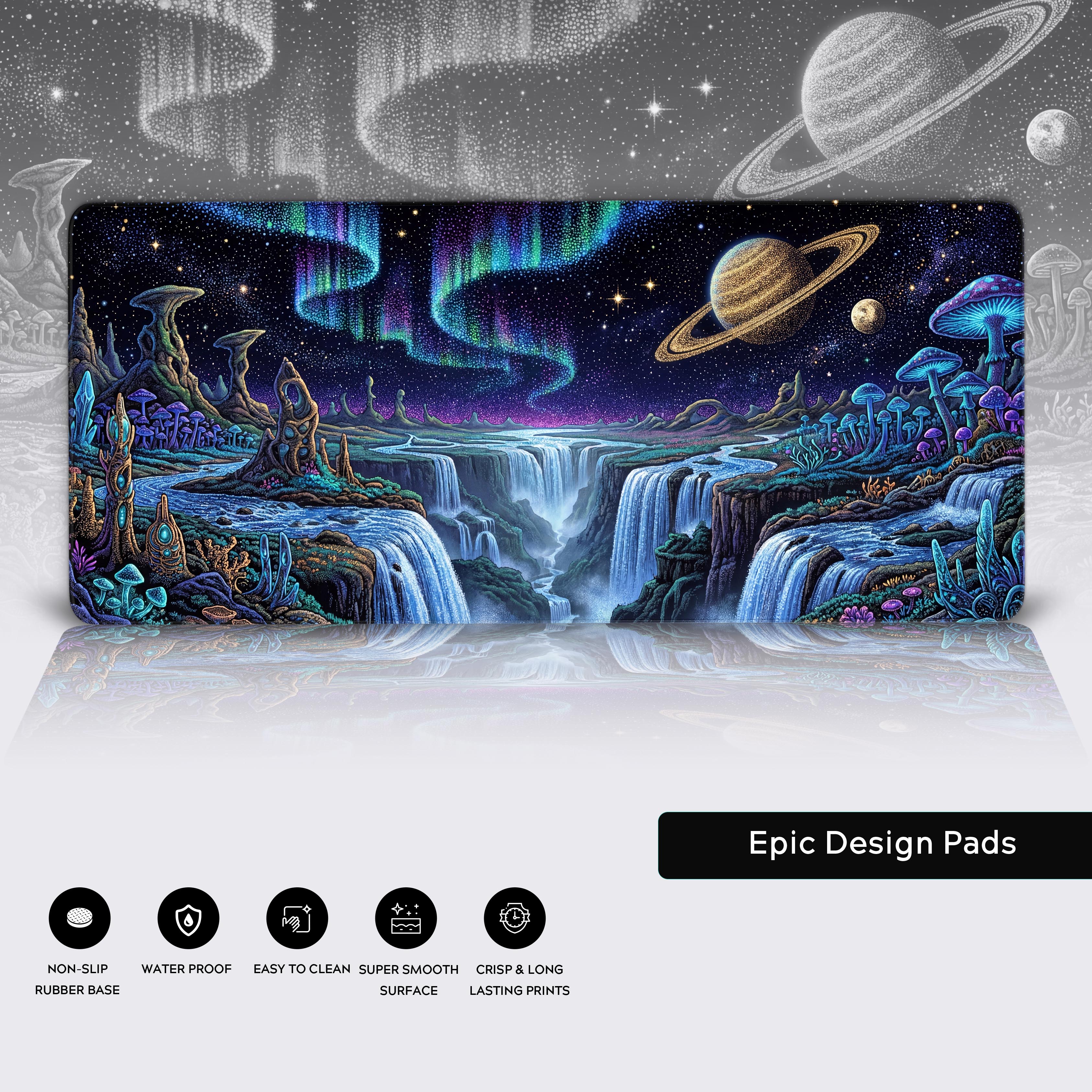 Transform your desk into a portal to the infinite with the Nebula Dreams desk mat. Escape the mundane and journey to a world where auroras flow like rivers and ringed planets watch over a bioluminescent valley. The mesmerizing stipple-style art creates a universe of vibrant, glowing points, inviting you to lose yourself in a moment of cosmic stillness.