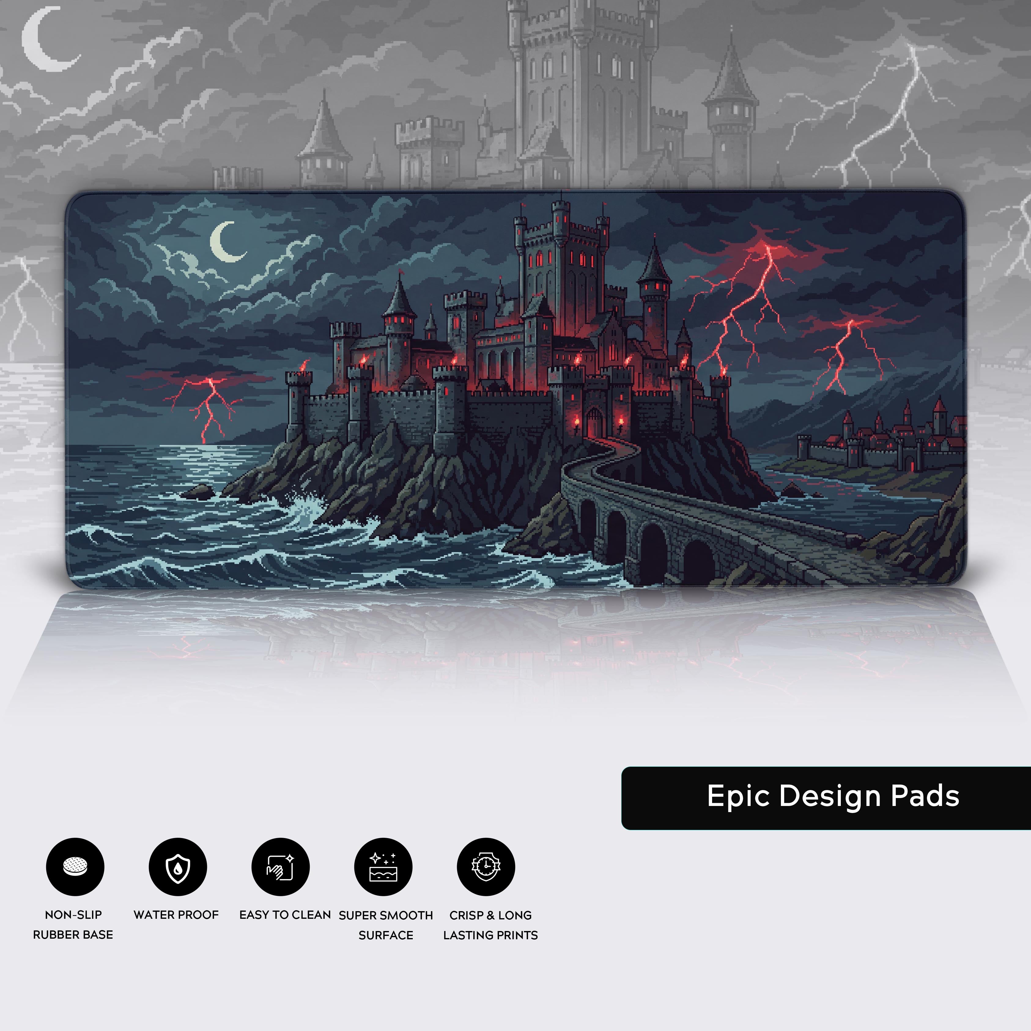 In the digital storm, your fortress holds. The Pixel Citadel desk mat transforms your workspace into a monument of resilience and retro artistry. This stunning pixel art design features a formidable castle against a stormy sea, illuminated by bolts of crimson lightning—a perfect scene for those who find strength in the tempest.