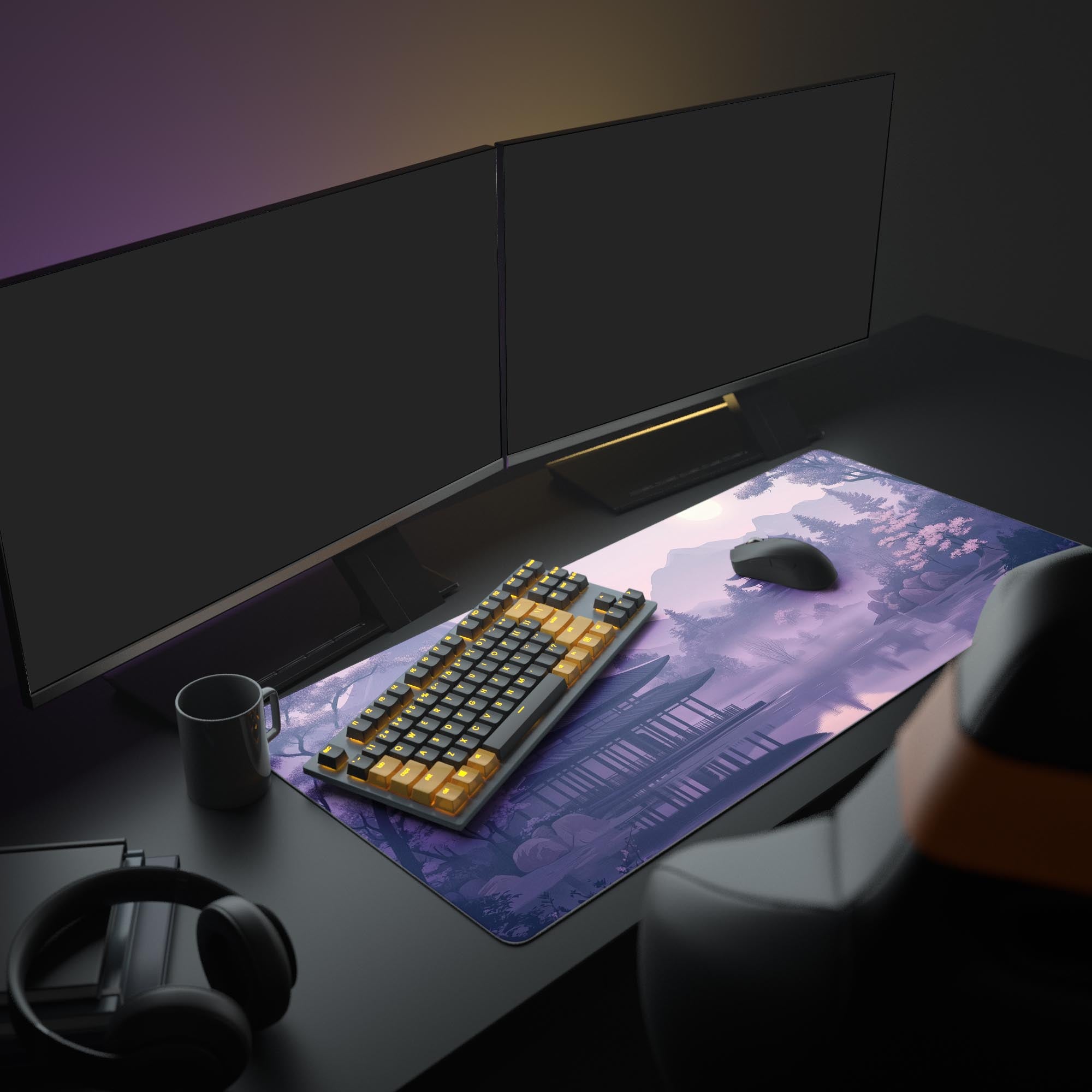 Immerse yourself in serenity with the Purple Japanese Desk Pad, a stunningly designed desk accessory that combines elegance with functionality. Skillfully crafted, this desktop pad captures the ethereal beauty of a Japanese landscape at dusk, featuring serene hues of purple and lavender. Traditional wooden pagodas and delicate cherry blossoms against the backdrop of majestic mountains create a tranquil and inspiring setting for any workspace.