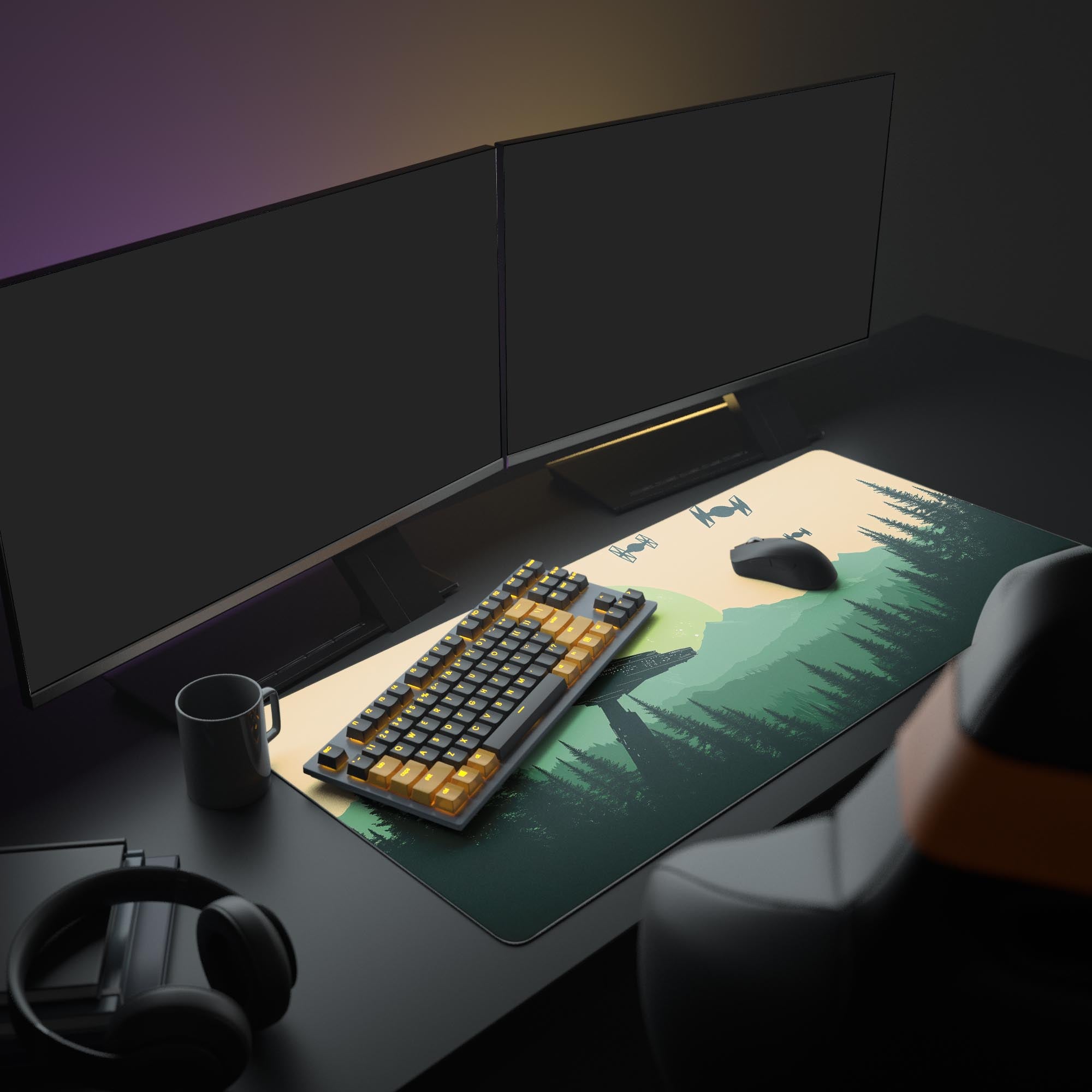 Transform your workspace into an otherworldly escape with the Galactic Forest Desk Pad. Designed for dreamers, creators, and those who crave a touch of adventure, this mat brings a futuristic wilderness to life with a minimalist landscape of dense evergreens, distant mountains, and a glowing green sun.
