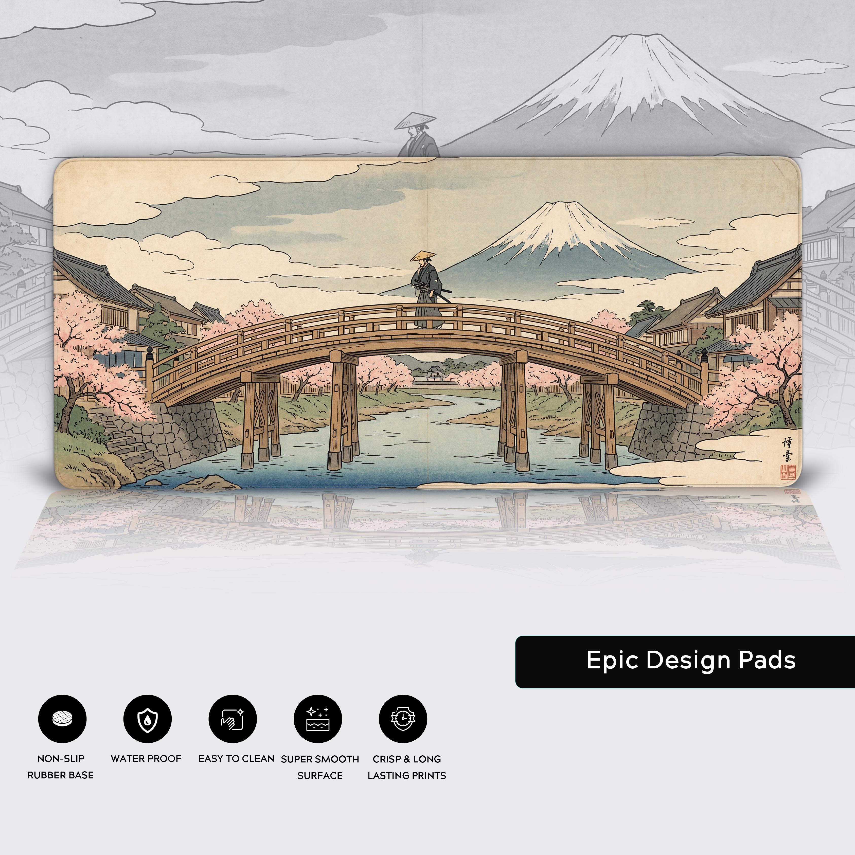 Every moment is unique, a concept captured by the Japanese term 'Ichigo Ichie'. This desk mat embodies that philosophy, depicting a lone rōnin paused on a bridge between the transient beauty of cherry blossoms and the eternal majesty of Mount Fuji.
