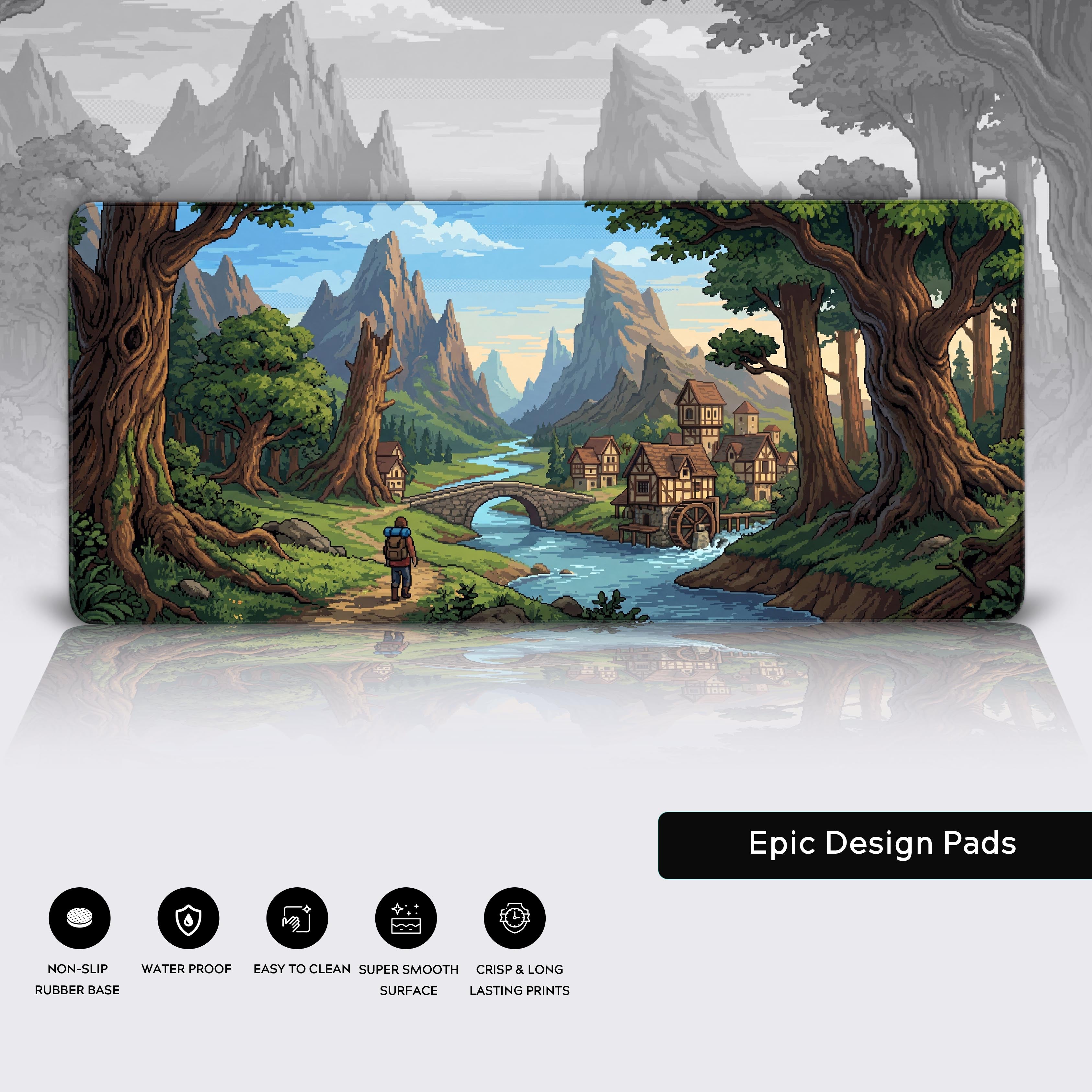 Every great saga starts with a single step. The Valley Hamlet desk mat captures that iconic moment of departure, rendered in nostalgic pixel art that pays homage to the golden age of RPGs. See the lone wanderer, the peaceful village, and the towering mountains that promise a grand journey ahead.