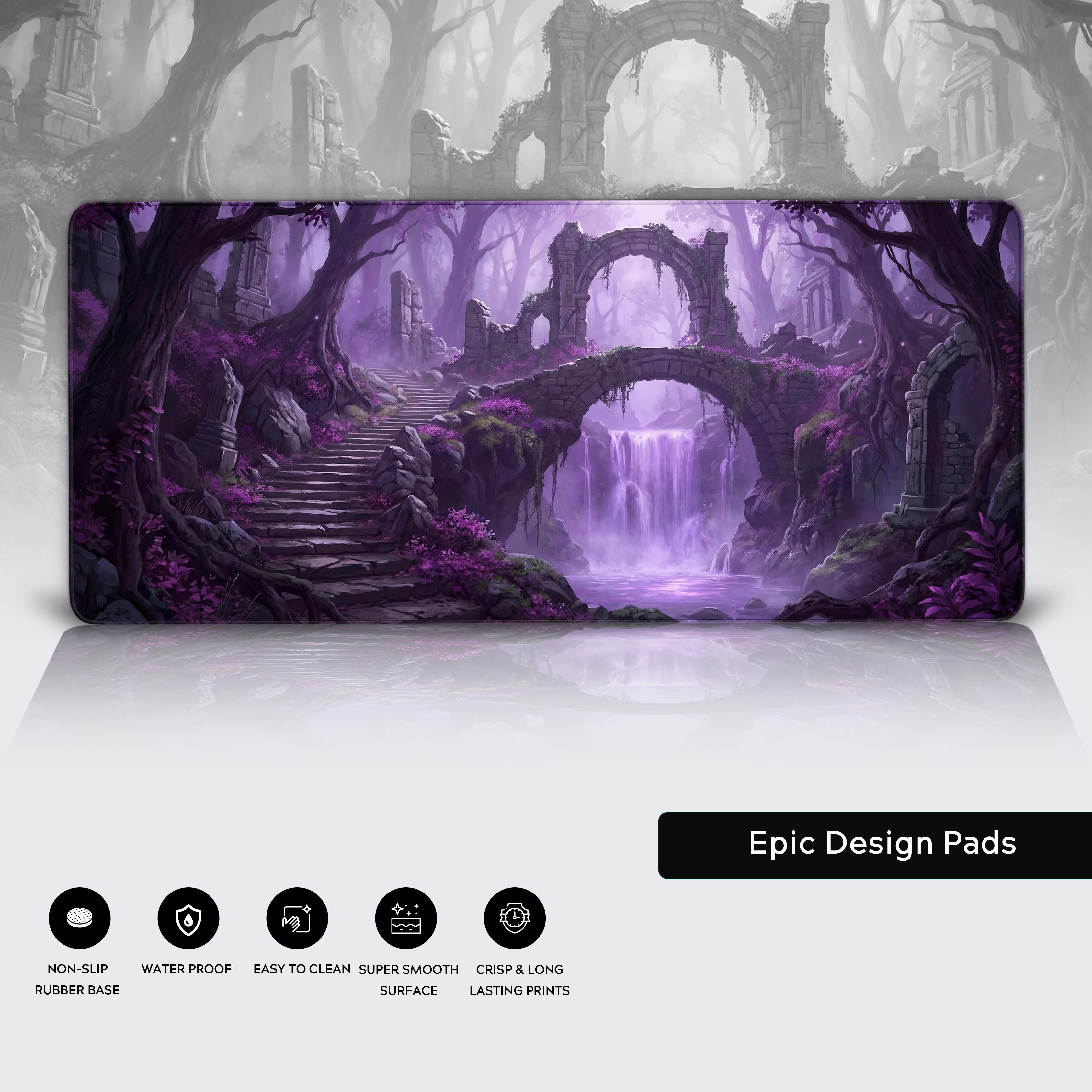 Transform your desk into a mystical sanctuary with the Violet Ruins desk mat. This design captures the haunting beauty of a forgotten world, bathed in a magical violet haze. Let the ancient stone arches and glowing waterfall inspire focus and calm during work or play.