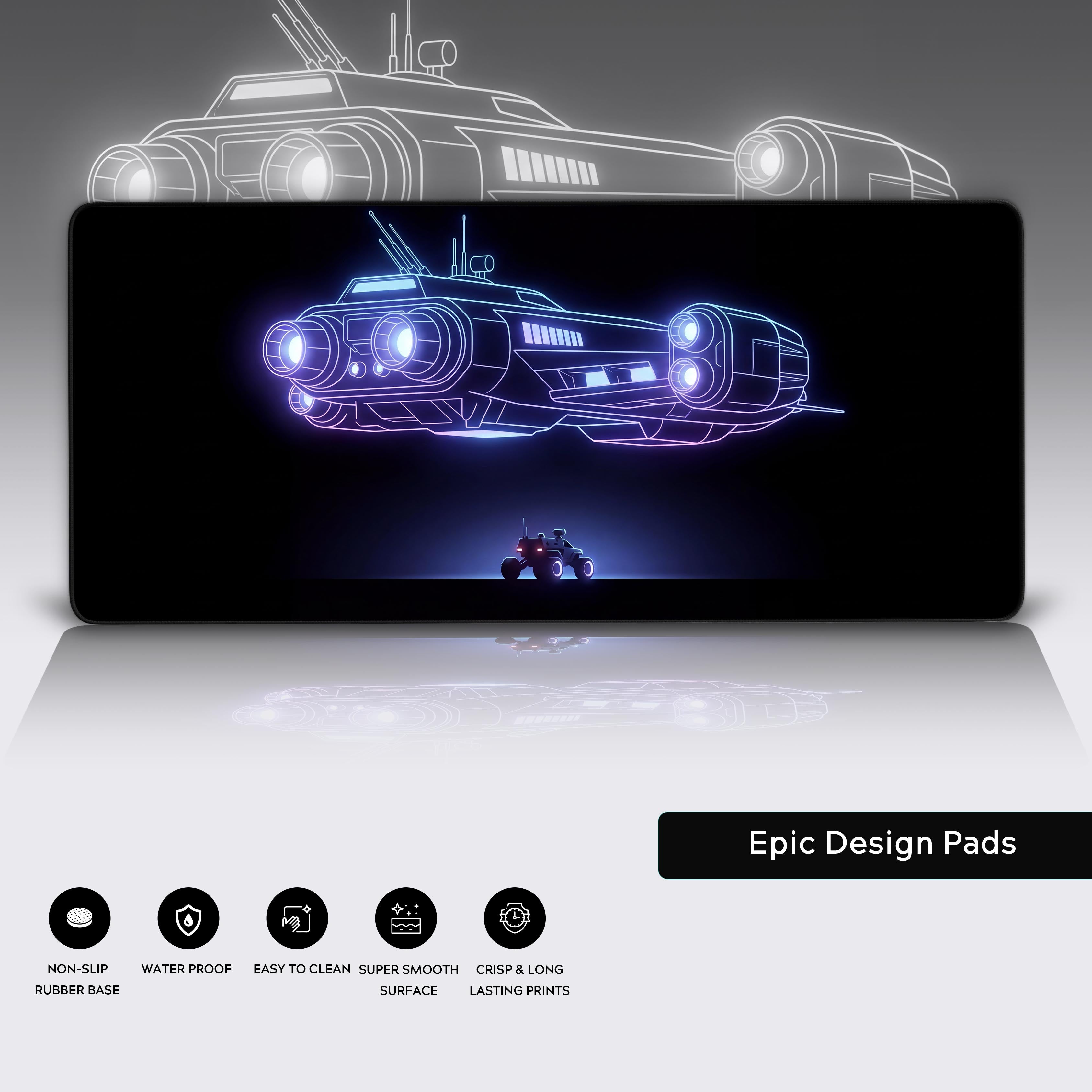 Exploration begins with a vision. The Void Schematic desk mat transforms your desk into the command center of a futuristic vessel, featuring the luminous soul of a machine laid bare. The glowing neon wireframes of the hover-ship and rover cut through the darkness, a testament to human ingenuity against the infinite unknown.