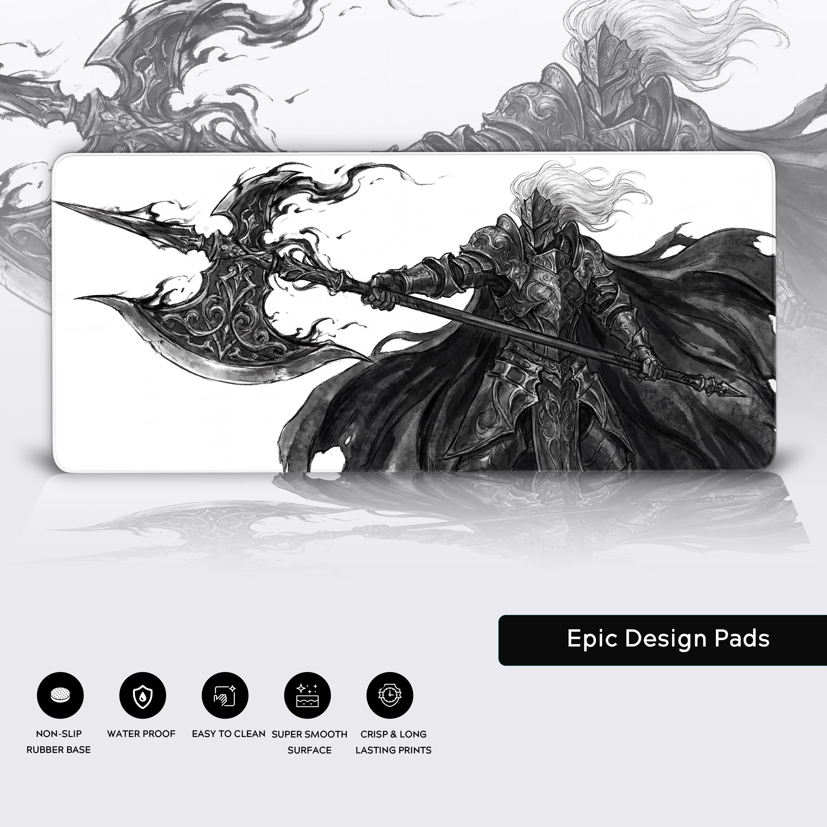 Channel the raw essence of power with the Void Vanguard desk mat. This stunning black and white design features an unconquerable armored sentinel, wielding a halberd that balances ornate detail with chaotic energy. It's a daily reminder of resilience and absolute strength, turning your desk into a testament to the unconquerable spirit.