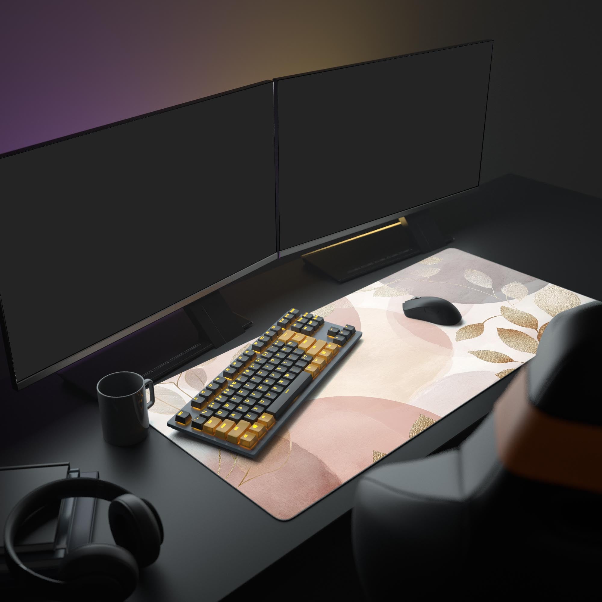 Inspired by delicate watercolor paintings, the desk pad features soft, overlapping circles in blush pink, beige, and warm taupe. Intricately overlaid golden leaves shimmer with metallic accents for a dreamy and modern look. The subtle gradients and translucent layers create a calming visual effect, turning your workspace into an oasis of tranquility.