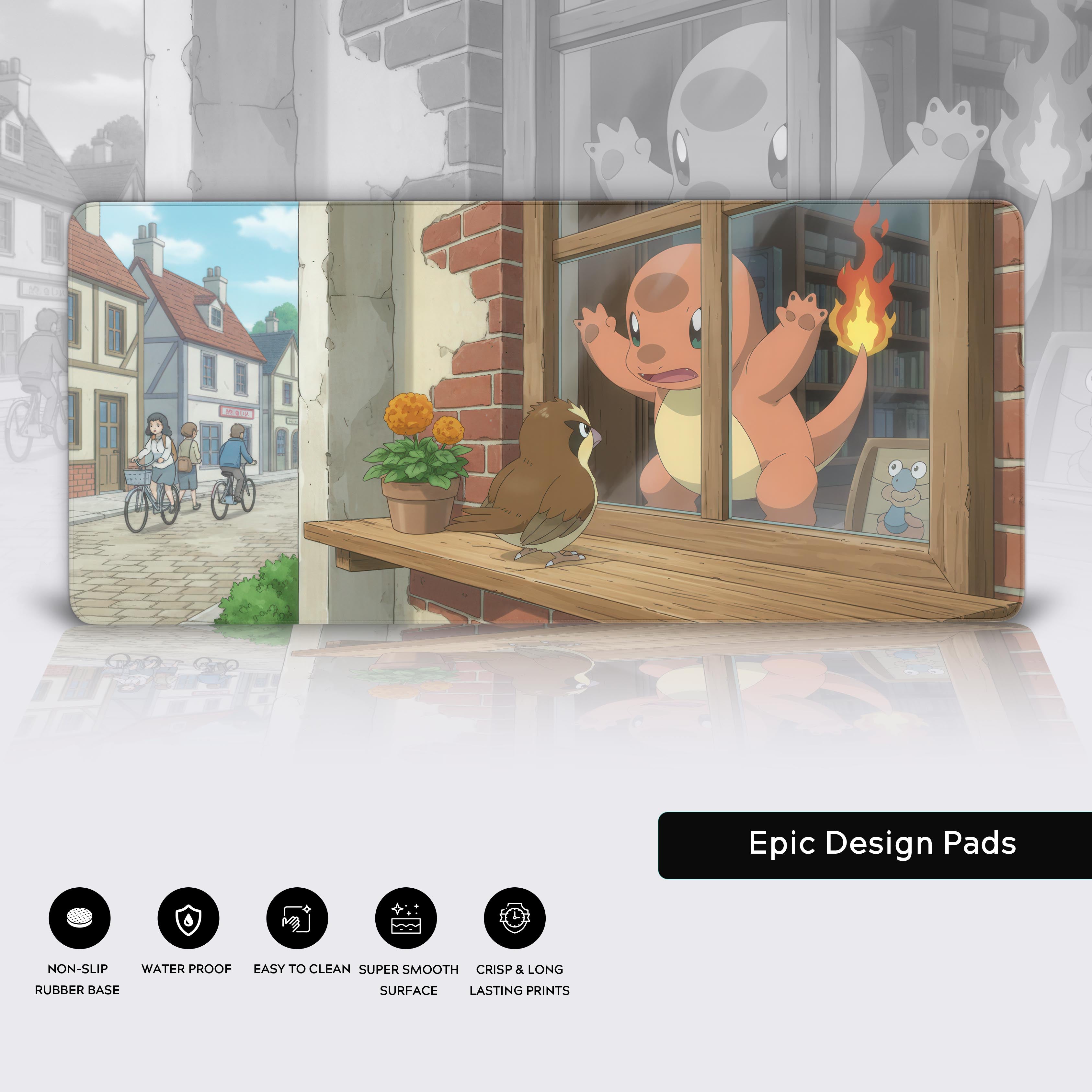 Tired of a bland, uninspired workspace? Imagine a spark of nostalgia right at your fingertips. Our "Window Watcher" desk mat brings a heartwarming Pokémon scene to life, featuring a curious Charmander gazing out at a serene village street, with a Pidgey perched peacefully nearby. It’s more than a desk accessory; it’s a portal to a cozier, more creative world.