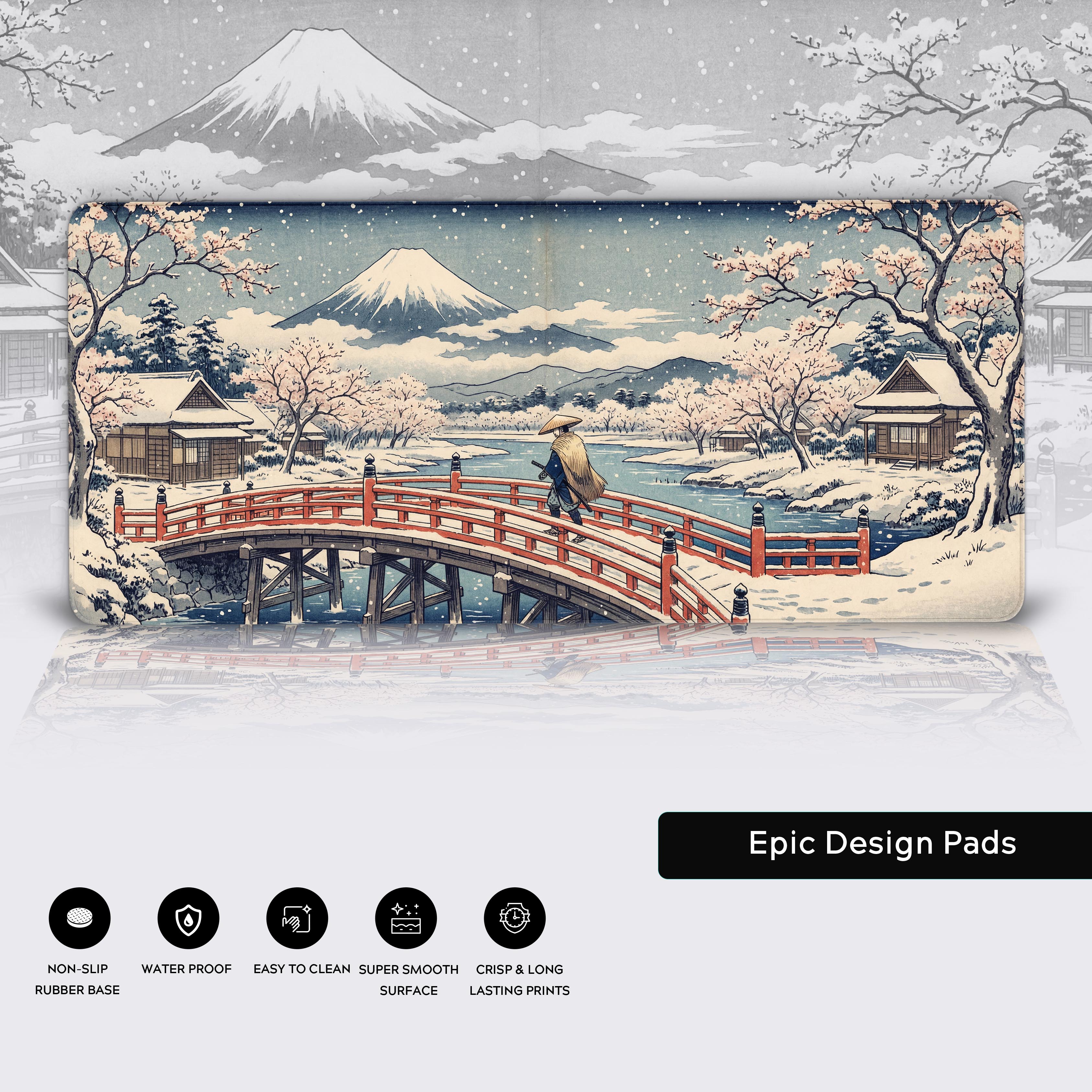 Transform your desk into a sanctuary of focus with the Winter Zen Path desk mat. This stunning Ukiyo-e inspired artwork captures a lone traveler's journey through a serene, snow-covered landscape. With Mount Fuji standing resolute in the background, this design is a powerful reminder that true progress is often made in quiet contemplation.