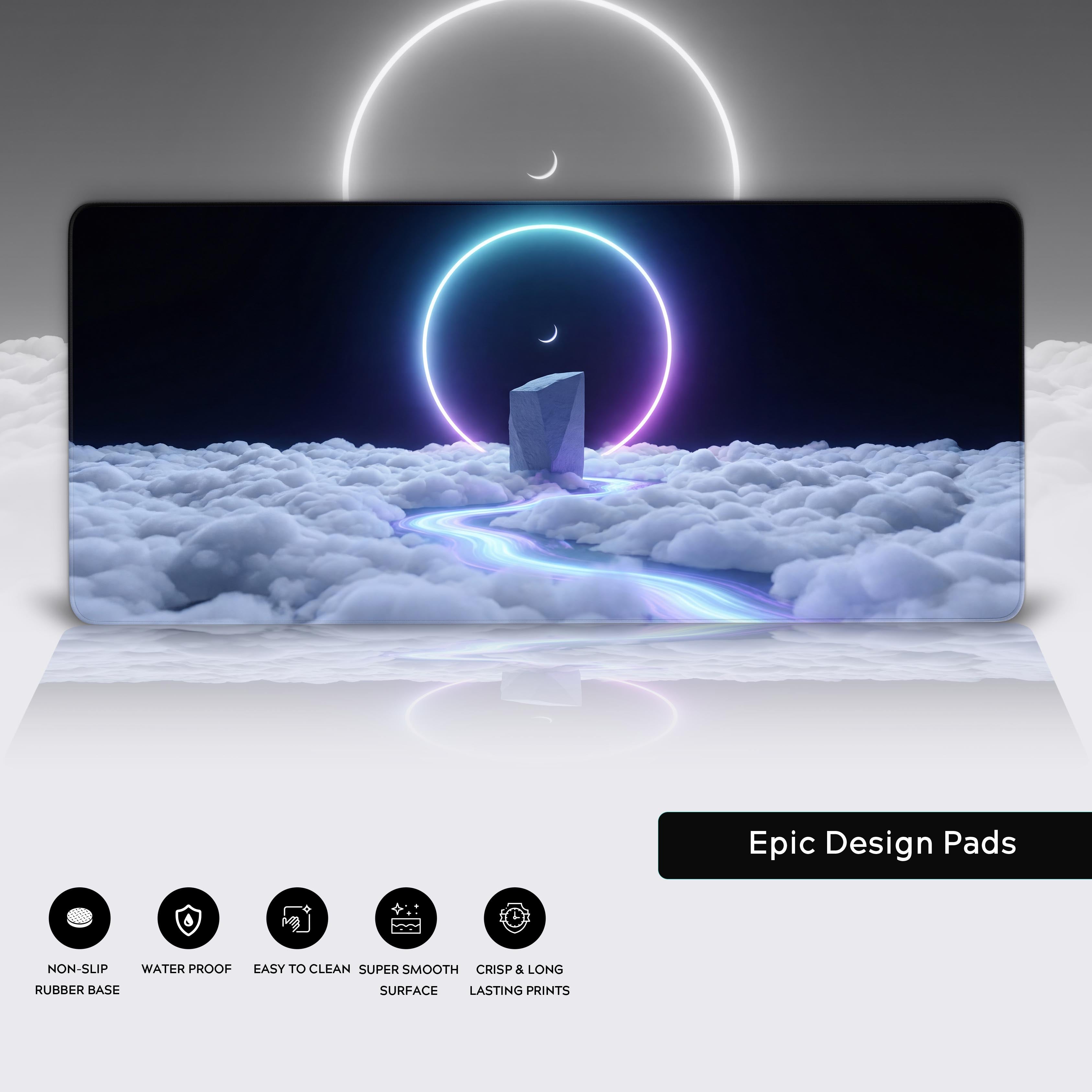 Transform your desk into a realm of calm and clarity with the Zenith Portal desk mat. Suspended above a sea of endless clouds, a solitary monolith stands framed by a glowing neon halo, offering a stunning visual escape from the everyday. A luminescent river carves its path through the soft vapors, creating a centerpiece that is both futuristic and deeply tranquil.